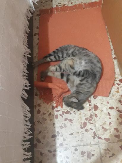 A Lucy la encontraron unos adoptantes nuestros, y después de varios intentos consiguieron meterla en el transportin. En cuanto llegó a casa se tumbó, bebió agua y comió. Es muy buena y mientras te mira amasa con las patas al aire. En las analíticas ha dado positiva a leucemia pero ella se encuentra bien.