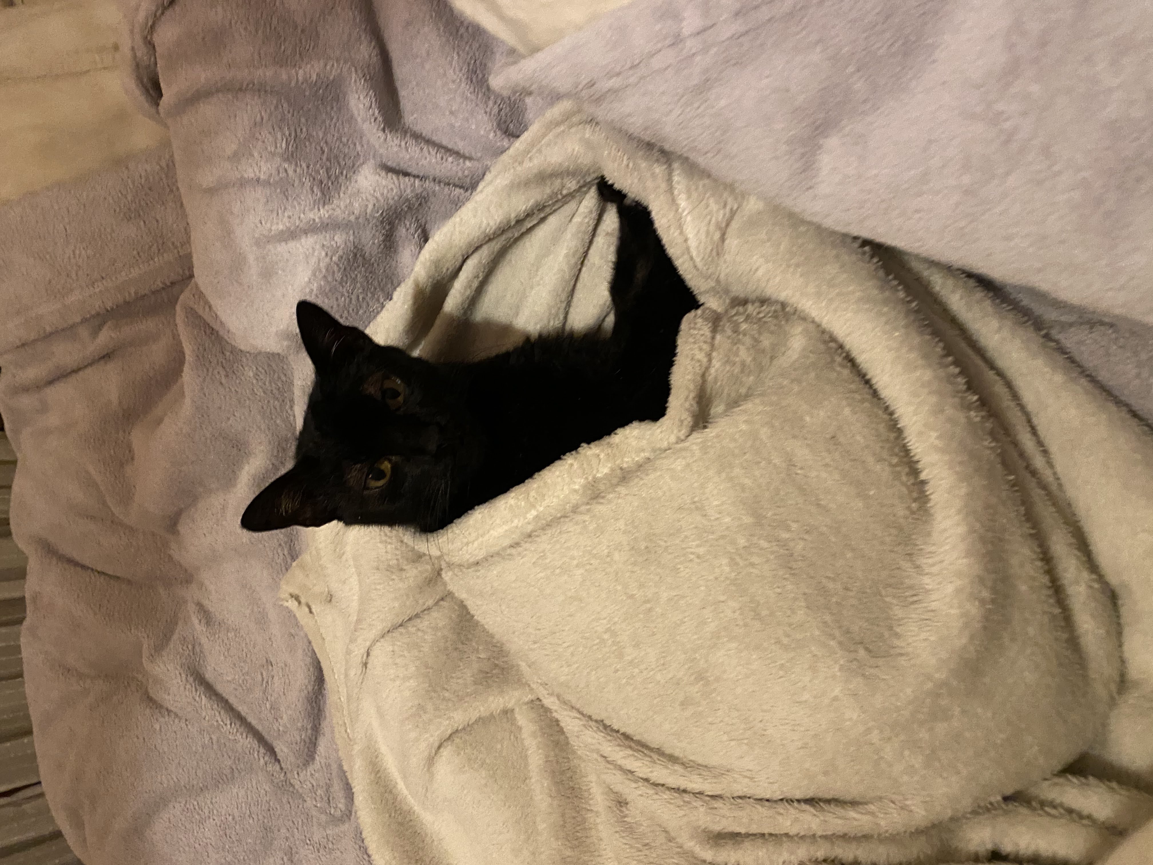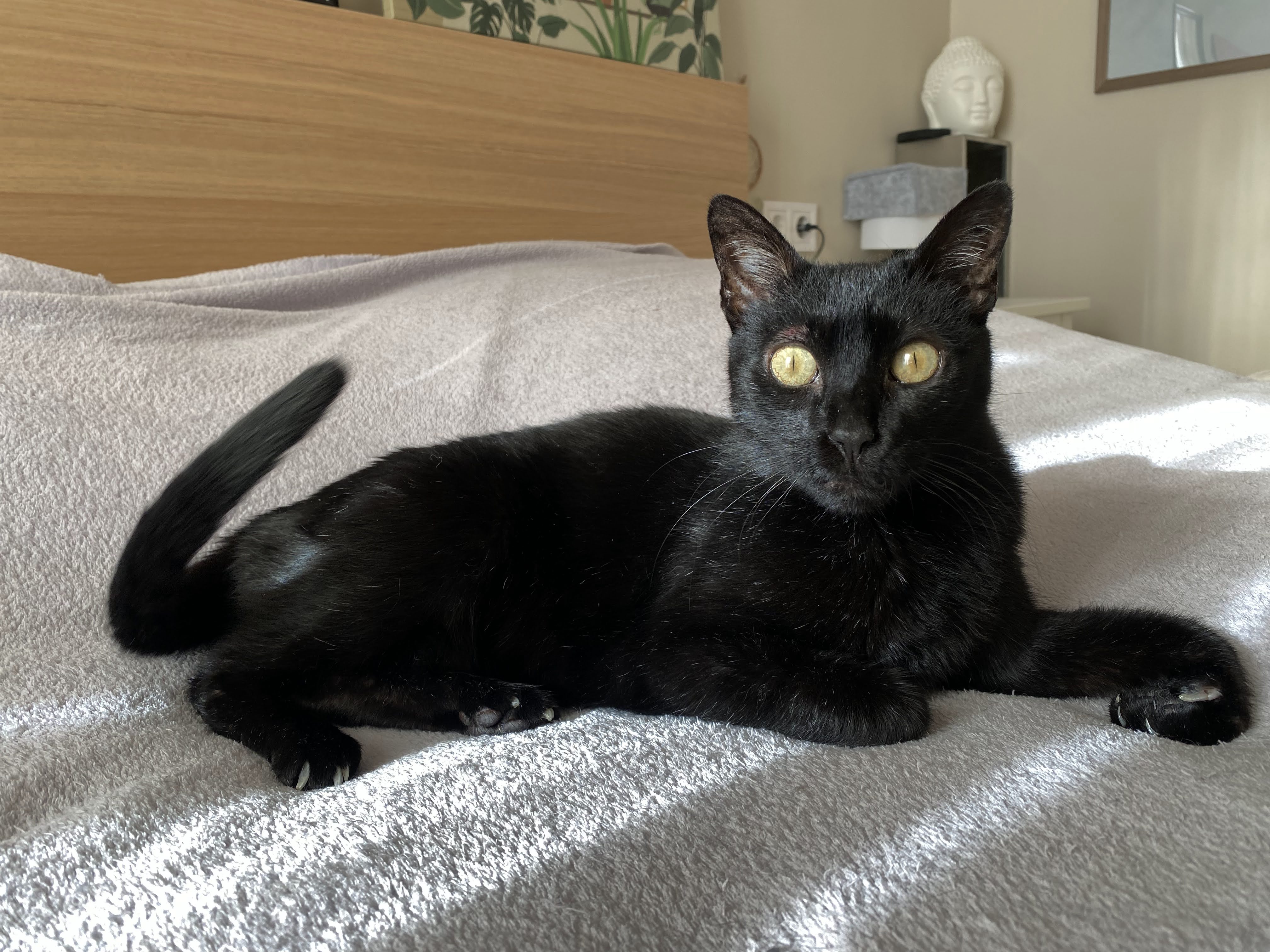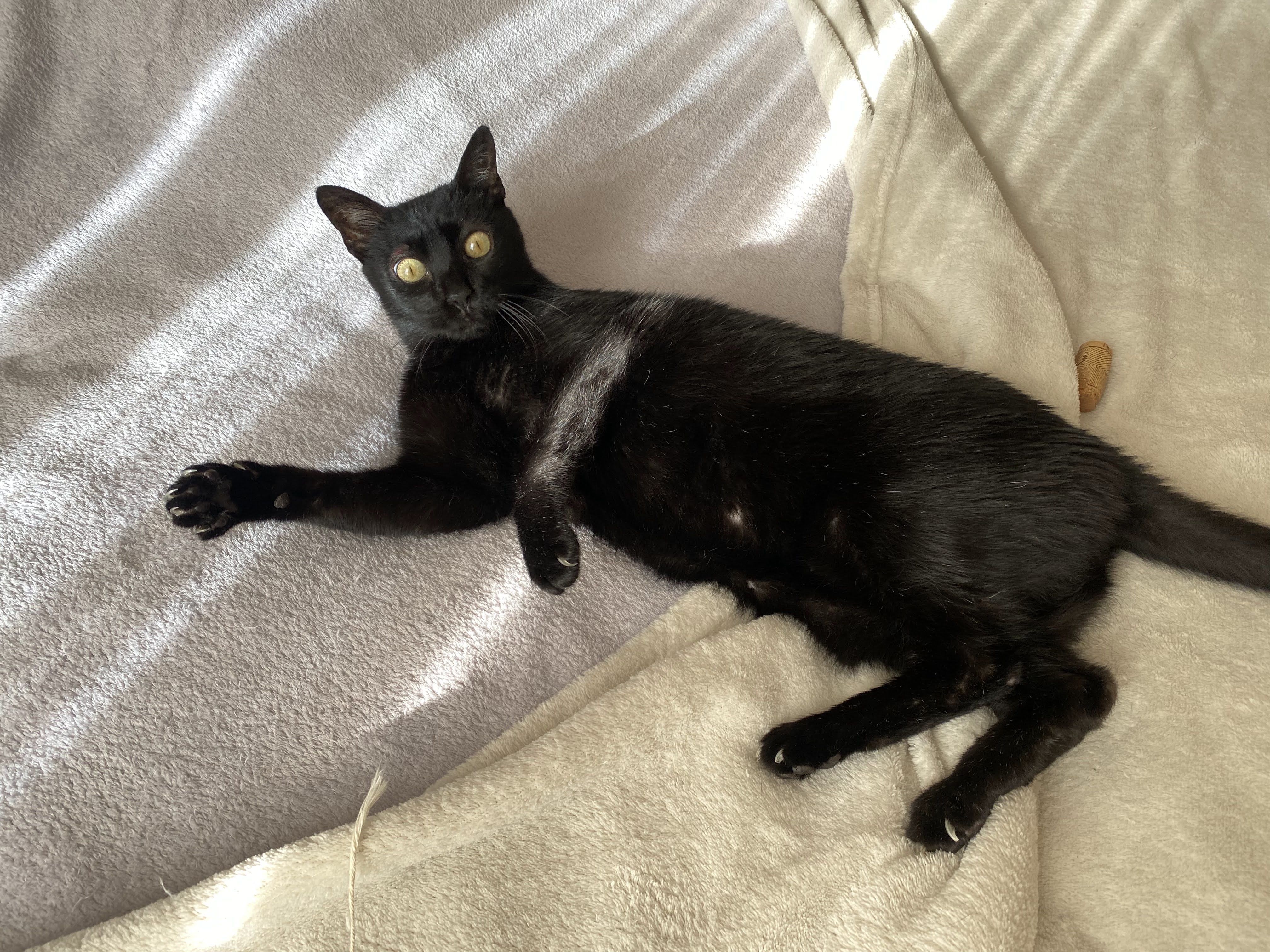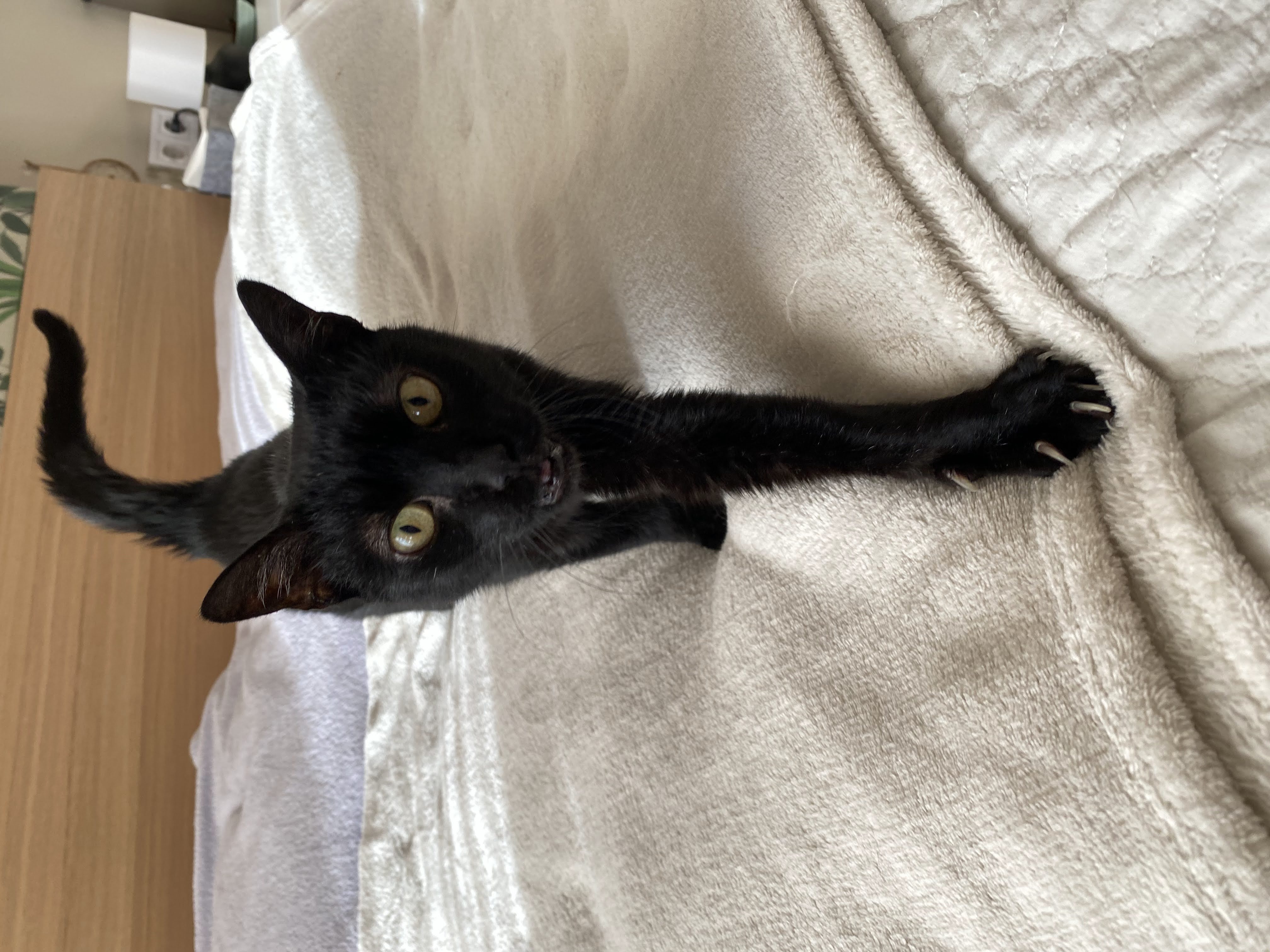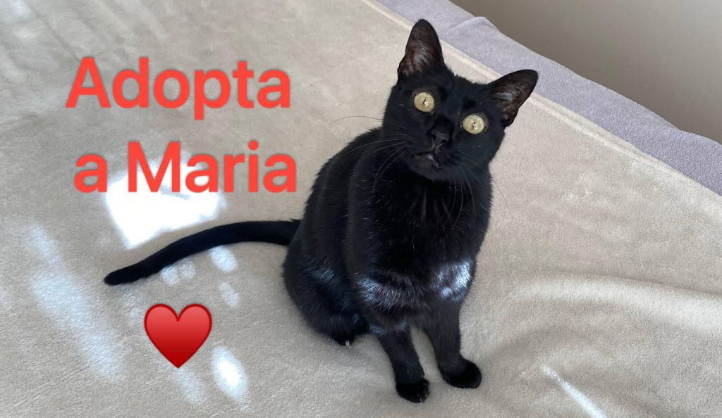 A María la rescatamos en un solar abandonado. Es una gatica algo asustadiza al principio pero muy cariñosa, dulce y buena. Le encanta dormir en un manta en forma de burrito.