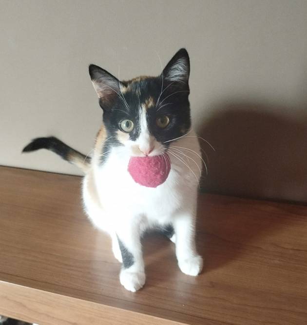 A Arepa la recogieron unas personas que la estuvieron cuidando a biberón unos días hasta que nos pudimos hacer cargo de ella. Es una gatita curiosa, valiente (no le tiene miedo a nada) y juguetona. Convive con otros gatos.
