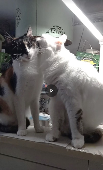 Esto nos cuenta su acogedora sobre ellos: Beethoven es un dulce y precioso gatito sordo que, aunque no ve muy bien, es listo, tranquilo y muy juguetón. Es inseparable de Naya, su gatita lazarilla, que es miedosita pero también muy buena y cariñosa cuando se confía. Les encanta hacerse jugar con los túneles de tela y las pelotas de papel Albal y tomar el sol en la ventana. Duermen juntitos y contigo si les dejas. Siempre acuden, felices de verte, a la puerta.