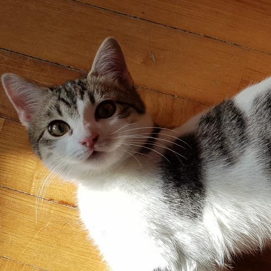 Blini apareció en el motor de un coche. La persona que lo pudo rescatar se pegó un día entero intentándolo y finalmente lo consiguió. Enseguida cogió confianza en su casa de acogida. Es un gatico muyyy dulce y bueno. Convive y se adapta muy bien con otros gatos ; con las personas al principio es tímido pero poco a poco se suelta y luego sólo pide mimos.