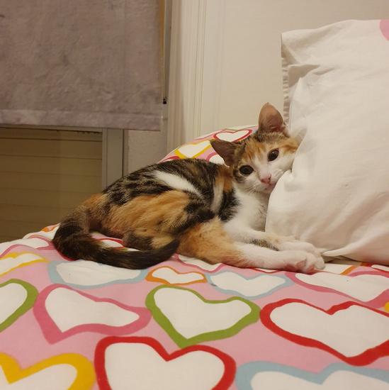 La pequeña Britney apareció un día en un patio interior de un centro de salud. Debía de estar con su madre pero se cayó y ya no la fue a buscar. Nos pidió ayuda la persona que la recogió. Es una gatica muy cariñosa y sociable, viene a pedir mimos cuando ella quiere (como muchos gatos). Es muy juguetona y activa.