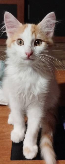Cheeto vino de la misma camada que Morica, en un pueblo donde corrían peligro. Es un gatito mimoso, juguetón y sociable. Tiene un pelo precioso, largo y le encanta darte besos en la boca.