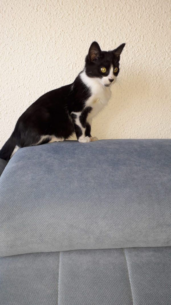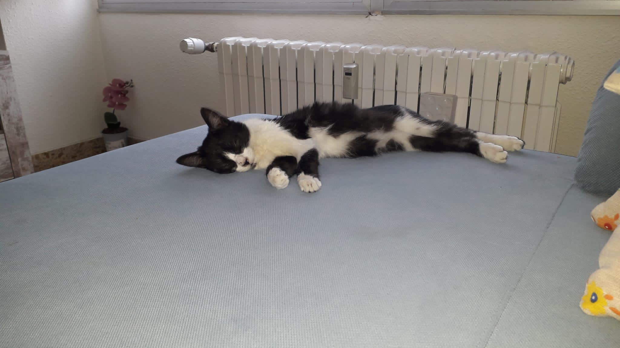 A Kiwi lo recogieron muy débil y en muy malas condiciones. Lo llevaron a revisión y tenía muchos parásitos. Ha estado recuperándose y ahora ha engordado y como veis está precioso. Es muy pizpireto, juega mucho (le encanta jugar con bolas de papel de plata) y aunque es algo tímido, también es muy dócil. Con los niños y los perros se lleva muy bien.