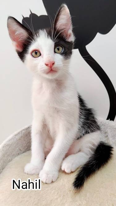 Nahil es hermano de Ikal, Inti y Wari. Son cuatro machitos sociables, juguetones y cotillas. Esto dice su casa de acogida : les encanta jugar y subirse a lo más alto, todos van al arenero sin problema, y te dejan agarrarlos, limpiarlos, y achucharlos, los más expeditivos son Inti e Ikal, Nahil y Wari les siguen detrás, les gustan las pelotitas chiquitas, y los peluches que no pesan, comen latita y pienso sin problema