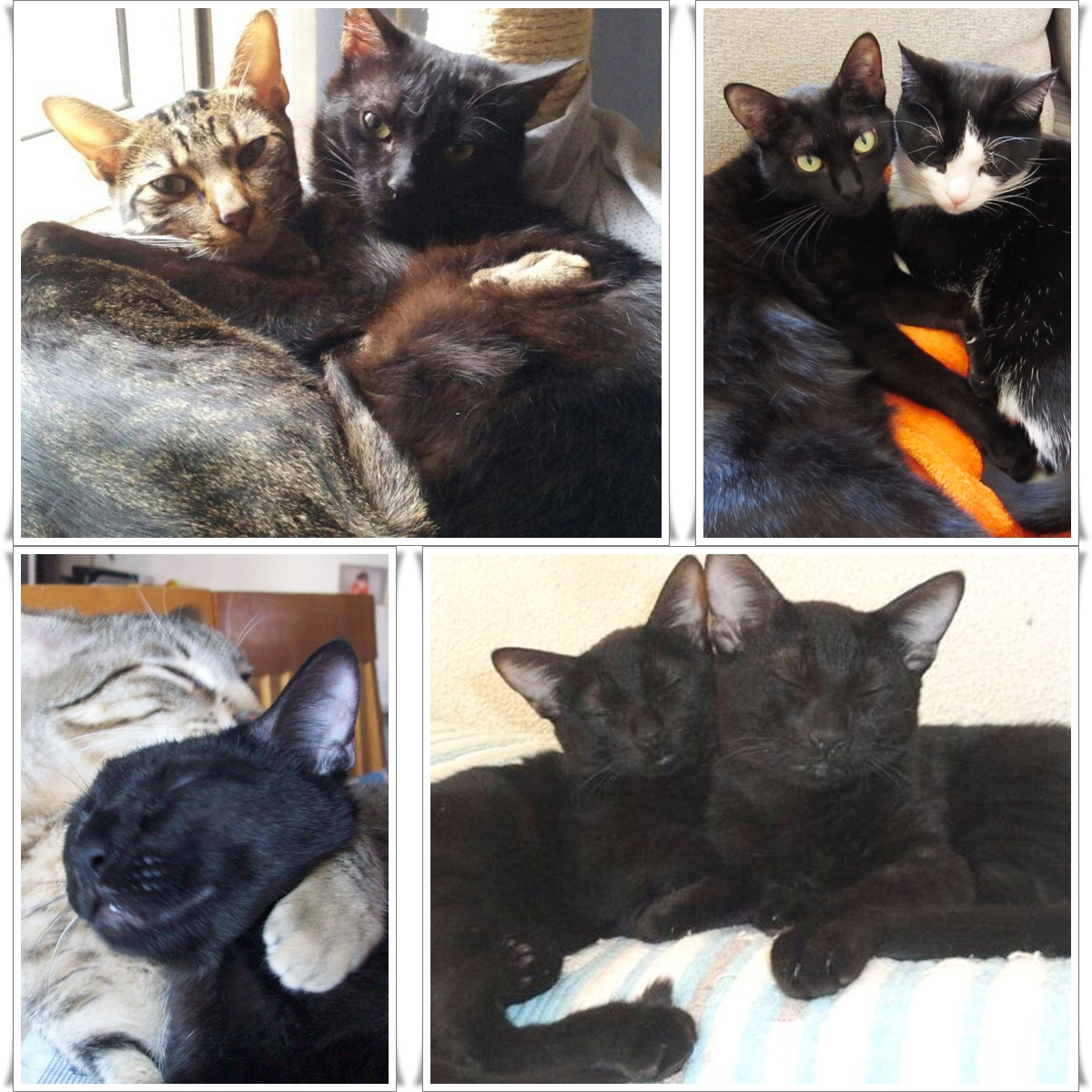 12/06/2013 Algunos dicen que los gatos son seres independientes y que no necesitan compañía. Bueno, pues nosotras conocemos a muchos muchos que no lo son, y que les encanta la compañía humana y gatuna… La verdad es que los gatos si pueden estar acompañados de otro gatico disfrutan mucho, se acicalan, se hacen compañía cuando se quedan solos, juegan juntos… Los reyes de los abrazos en Zaragatos son nuestros negritos, todo dulzura! Y de muestra esta preciosa colección de abrazos gatunos. A nosotras siempre nos enternece verlos así. Si ya tienes gato, adopta un gatico para darle un compañero “abrazador”. En la foto Odín y Robin; Ada y Aby; Nemo y Peque; Amy y Mary.