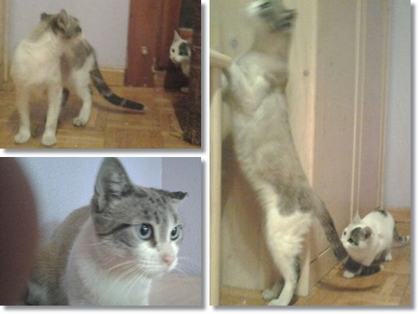 29-05-2013 El fin de semana del 7, 8 y 9 de junio hay organizado en las Delicias un mercadillo benéfico solidario y vamos a estar allí, necesitamos voluntarios que nos ayuden a estar en nuestro stand de Zaragatos. Cuantos más seamos mucho mejor, así se reparte el tiempo y el trabajo.Es una buena oportunidad para conocernos y ayudar a los peludines. Si os apetece colaborar, mandad por favor un mensaje a: voluntarios.zaragatos@gmail.com. Muchas gracias de antemano a todos!! 16-05-2013 Pedro, el adoptante de Fibi, nos manda esta preciosa composición de su familia felina. Qué trío tan precioso!!!!!!