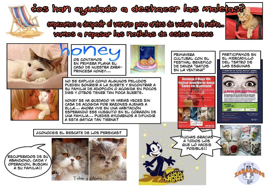 Hace días que no actualizamos esta página de noticias, porque no tenemos muchas noticias que contar. Seguimos buscando casa de acogida para Elvis, Honey y Bimba… Seguimos sin poder atender a tanto gato necesitado que sigue llamando a nuestras puertas porque no tenemos sitio… Nuestros gaticos siguen bien, atendidos y queridos por nuestras maravillosas casas de acogida, mientras esperan su hogar definitivo. Algunos se han ido de vacaciones con su acogedores, como Vegan, que cotillea por la nueva ventana, tan guapa y tan buena como siempre. Ada, como otros muchos zaragaticos, se ha quedado en Zaragoza y pasa estos calurosos días vagueando a pata suelta… ¡Feliz verano!