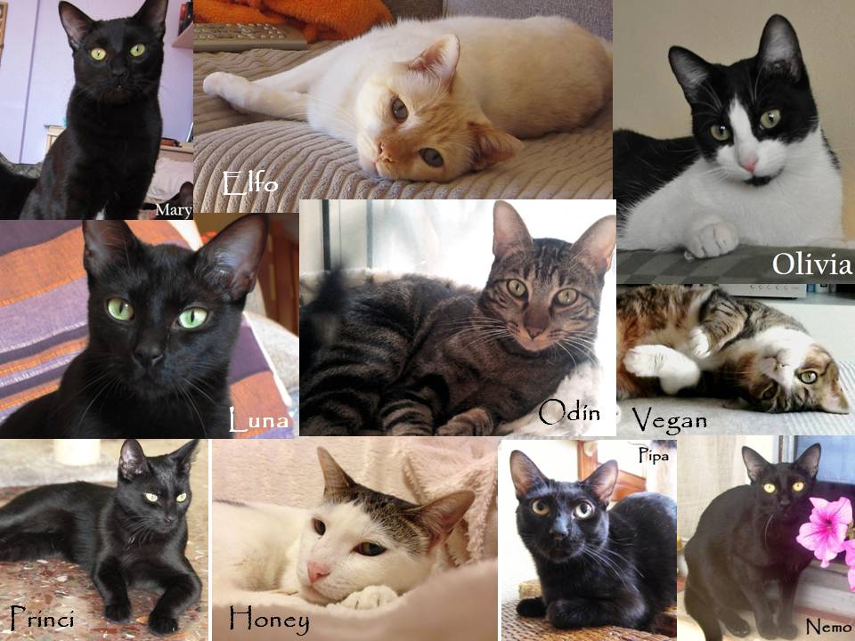 21-04-2013 ¡Qué puñadito de fotos preciosas! porque preciosos son todos… y ¡cómo nos alegramos de que estén todos bien y felices!. Son Queen (antes Lulú) con una pose felina preciosa, Sei (antes Iris) que ahora comparte su vida con una niña, la preciosa Rita con su carita de buena, Nut haciendo estiramientos, Nico y Hugo (antes Chester) que como veis se llevan genial y Cork, guapísimo, luciendo palmito y rascador :).