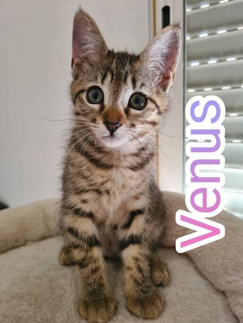Venus es una de las pequeñas de la mami Ixchel, que nacieron ya a salvo en una casa. Todos son sociables, cariñosos, les encanta jugar y salen a recibirte cuando llegas a casa. Duermen contigo y les encanta que juegues con ellos con cordones y pelotas.